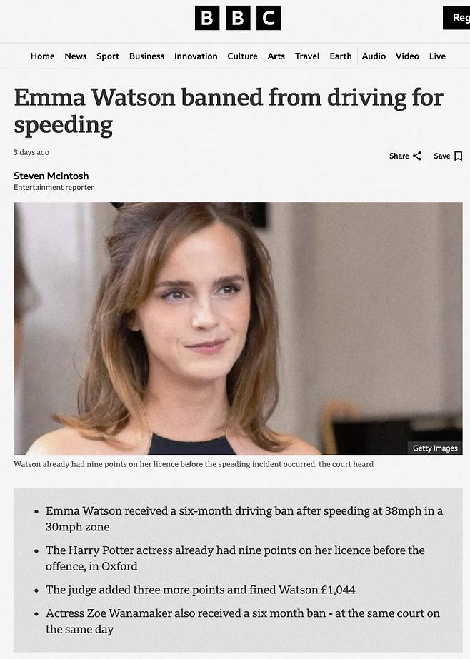 16일 BBC 등에 따르면, 위컴 치안법원은 왓슨이 지난해 7월 옥스퍼드의 시속 30마일(약 48.3㎞) 제한 도로에서 38마일(약 61.2㎞)로 운전한 데 대해 벌금 1044파운드(약 195만원)를 명령하고 6개월 면허 정지를 결정했다.
