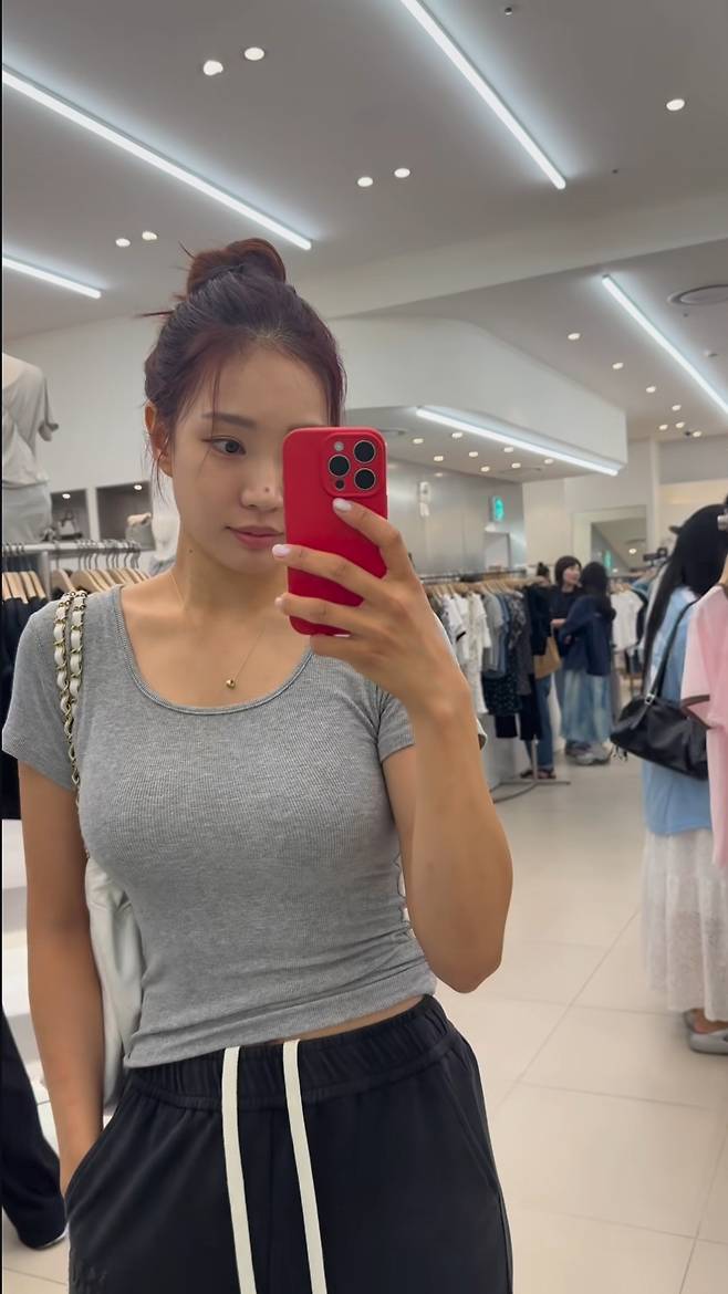 유현주는 심플한 그레이 컬러의 슬림핏 반팔 티셔츠에 블랙 트레이닝팬츠를 매치해 내추럴한 스타일링을 완성했습니다.