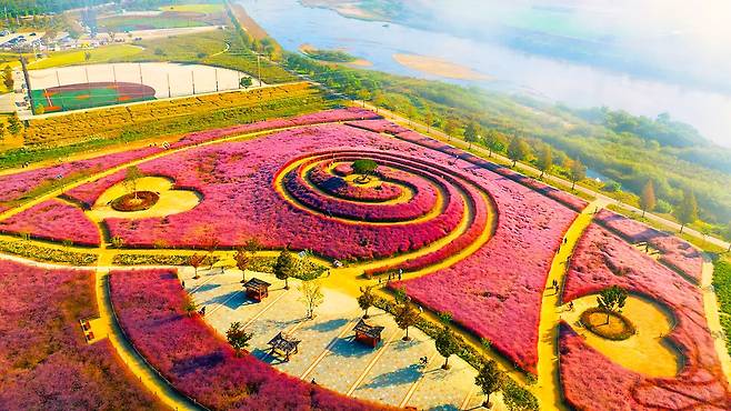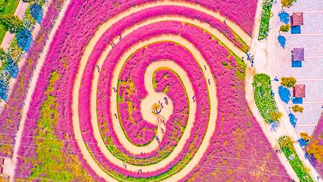 무려 16,000㎡, 축구장 2.2개를 합친 규모의 대지가 온통 핑크뮬리로 채워져 있다.하늘에서 내려다보면 마치 롤리팝 사탕을 닮은 나선형 동심원 패턴이 그려져 있어, 어느 각도에서나 입체적인 풍경을 감상할 수 있다.