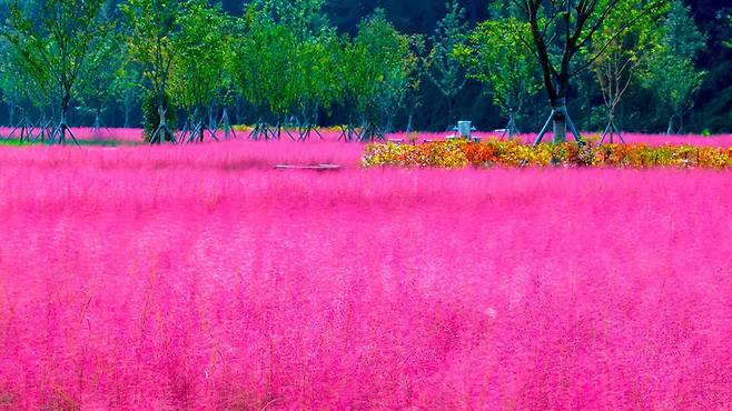 빛의 각도에 따라 연분홍에서 자줏빛으로 변하는 핑크뮬리의 색감은 마치 몽환적인 설치미술 작품을 걷는 듯한 느낌을 준다.