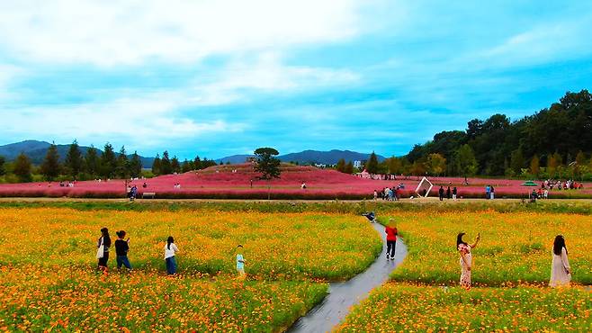 수만 송이의 황화코스모스가 황금빛 물결을 이루며, 핑크와 골드의 조화로운 색채가 완벽한 가을의 절정을 만들어낸다.