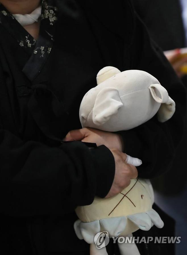 (대전=연합뉴스) 강수환 기자 = 대전 서구 둔산동 스쿨존에서 만취운전자 차량에 치여 숨진 배승아(9) 양의 발인식이 열린 11일 오전 을지대병원 장례식장에서 배 양의 어머니가 딸이 생전에 좋아하던 인형을 품에 끌어안은 채 흐느끼고 있다. 2023.4.11