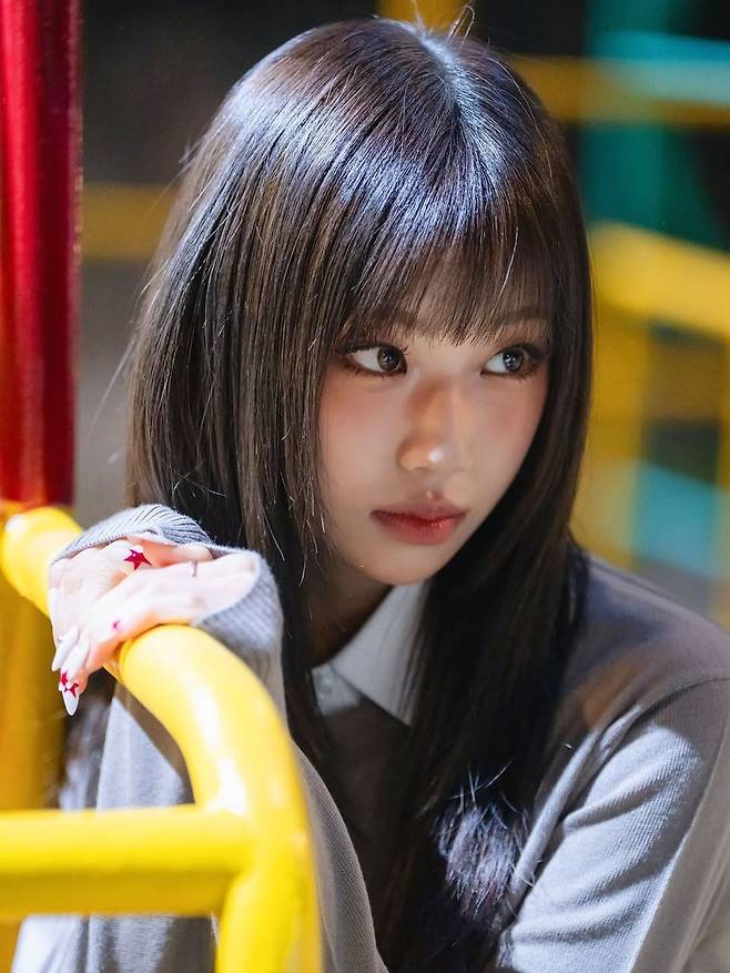 눈에 띄는 부분은 액세서리다. 형형색색의 미니 키링이 연결된 체인 목걸이는 자칫 밋밋할 수 있는 룩에 생기를 불어넣는다. 여기에 아기자기한 별 모양 네일과 긴 생머리 스타일이 조화를 이루며, 전체적인 키치 무드를 완성했다. 두 번째 사진에서는 그레이 니트와 흰 셔츠의 레이어드 룩으로 차분하면서도 세련된 분위기를 연출해 상반된 매력을 선보였다.