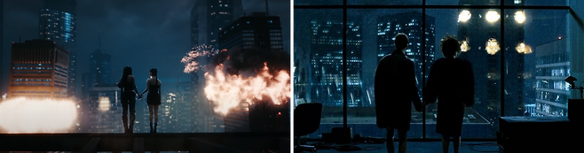 뒤이어 폭발음이 울려 퍼지는 도시가 등장하고, 흔들리는 건물 앞에 나란히 선 아이린&슬기는 더 이상 경쟁하지 않습니다. 대신 서로의 손을 맞잡은 채 그 변화를 묵묵히 마주하죠. 이 장면은 영화 <파이트 클럽>의 엔딩 장면을 오마주한 연출이 인상적인데요. <파이트 클럽> 역시 충돌하던 두 개의 자아가 하나로 결합하는 내용으로, 두 사람이 나란히 서서 건물이 무너지는 걸 바라보는 구도 및 연출뿐 아니라 스토리까지 닮아 있다는 점도 하나의 포인트랍니다😯.