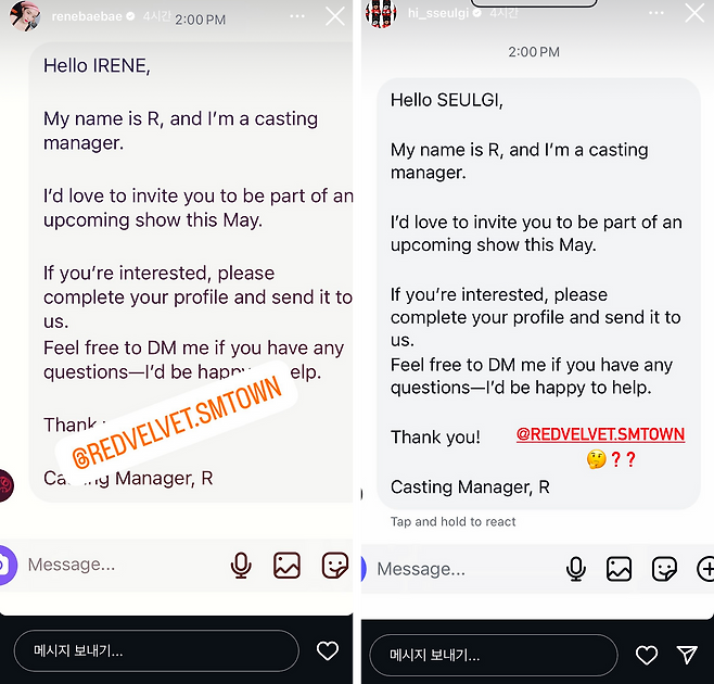 이번 컴백은 사전 공지 없이 SM엔터테인먼트 뉴스룸 보도만을 통해 전해졌는데요. 정확한 일정이나 방식은 알려지지 않아 팬들의 궁금증을 증폭시켰습니다. 그러던 중, 아이린과 슬기의 개인 인스타그램 스토리에 올라온 정체불명의 DM 캡처 이미지가 본격적인 신호탄이 되었죠! ‘캐스팅 매니저 R’이라는 인물로부터 도착한 해당 DM은 “5월에 열리는 쇼의 모델로 섭외되었으니 프로필을 보내달라”는 내용이 담겨 있었고, 멤버들은 이 DM을 개인 인스타그램에 직접 공유하며 독특한 방식으로 컴백의 서막을 열었습니다!