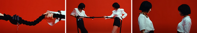 브랜드 필름 Pt.2는 앞선 Pt.1에서의 긴장감을 더욱 밀어붙이며, 두 사람 사이에 흐르는 팽팽한 대결 구도를 본격적으로 펼쳐 보입니다. 특히 강렬한 붉은 배경 아래 아이린과 슬기가 서로를 밀어내면서도 동시에 끌어당기듯 단단히 엮인 채 줄다리기를 이어가는 모습이 인상적인데요. 서로를 향한 도발적인 눈빛은 지금 당장이라도 터질 듯한 일촉즉발의 분위기를 보여주는 것만 같습니다. 이는 균형을 찾아가는 여정 속 마주하는 ‘대립’의 순간을 시각적으로 구현한 파트라고 볼 수 있겠죠.