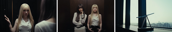 타이틀곡 ‘TILT’의 뮤직비디오는 서로를 끊임없이 밀어붙이며 끝내 한계를 넘어서는 아이린과 슬기의 서사를 잘 표현하고 있습니다. 같은 공간 안이지만 다른 방향으로 움직이는 두 사람은 끊임없이 서로를 의식하고 견제하죠. 특히 거울 앞에서 서로를 응시하는 장면은 한 사람 안의 두 자아가 충돌하는 듯한 인상을 주기도 합니다.