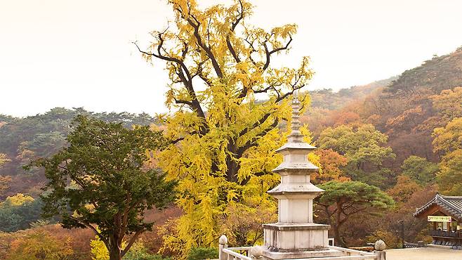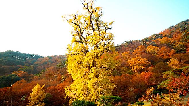 햇살이 비치는 각도에 따라 반짝이는 황금빛이 산 전체를 물들고, 바람에 스치는 은행잎이 하늘에서 흩날리는 장면은 압도적인 아름다움을 선사합니다.