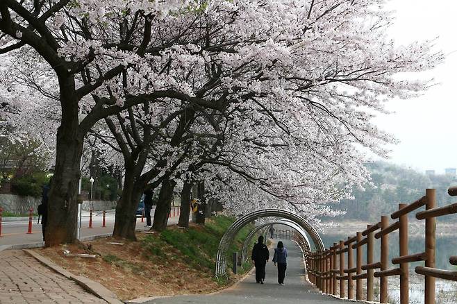 호수에서 불어오는 시원한 바람을 맞으며 흩날리는 꽃비 속을 걷다 보면, 스트레스가 싹 날아가는 느낌입니다.