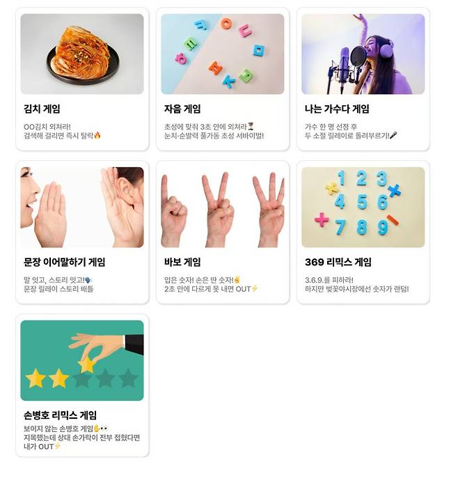 김치 게임, 자음 게임, 나는 가수다 게임, 문장 이어말하기 게임, 바보 게임, 369 리믹스 게임, 손병호 리믹스 게임처럼 이름만 들어도 바로 참여 방식이 떠오르는 프로그램이 준비돼 있습니다. 전체적으로 어렵거나 설명이 긴 콘텐츠보다는, 현장에서 바로 웃고 반응할 수 있는 레크리에이션형 구성입니다.
