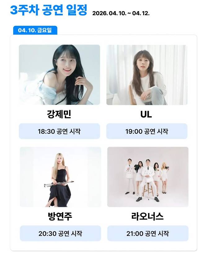 이번 군산 벚꽃 축제는 벚꽃만 예쁜 행사가 아니라, 주말 저녁마다 분위기를 확 끌어올리는 공연 라인업까지 제법 탄탄하게 짜여 있습니다. 2주 차 공연은 4월 4일부터 5일까지 조소현, 하늘이, 신촌타이거즈, 봄비트가 무대에 오릅니다. 다음 날인 5일 일요일에는 신나라, 하늘이, 조소현, 봄 비트, 신촌 타이거즈의 무대가 준비됐습니다.