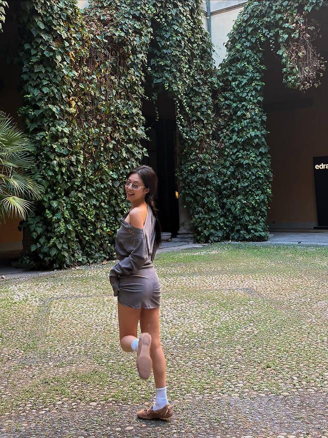 블랙핑크 제니가 인스타그램에 올린 한 장의 사진이 패션 팬들의 눈길을 끌고 있다. 고즈넉한 정원, 담장을 가득 채운 초록빛 담쟁이덩굴을 배경으로 그녀는 올리브 그린 톤의 미니 드레스를 입고 여유로운 포즈를 취했다. 한쪽 어깨를 자연스럽게 드러낸 오프숄더 실루엣이 청량한 분위기와 함께 쇄골 라인을 강조하며, 특유의 우아한 각선미가 시선을 붙든다.