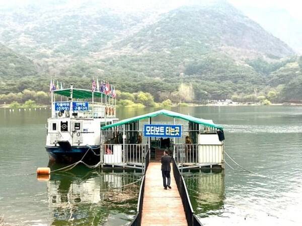 여행의 마지막 코스는 산막이마을에서 유람선을 타고 괴산호를 돌아보는 체험이에요. 유람선은 차돌바위 선착장에서 출발해 산막이마을까지 운행되는데요,