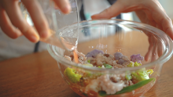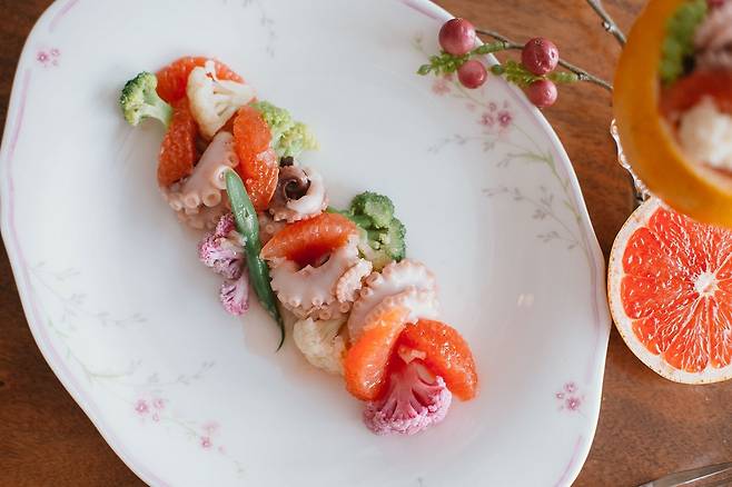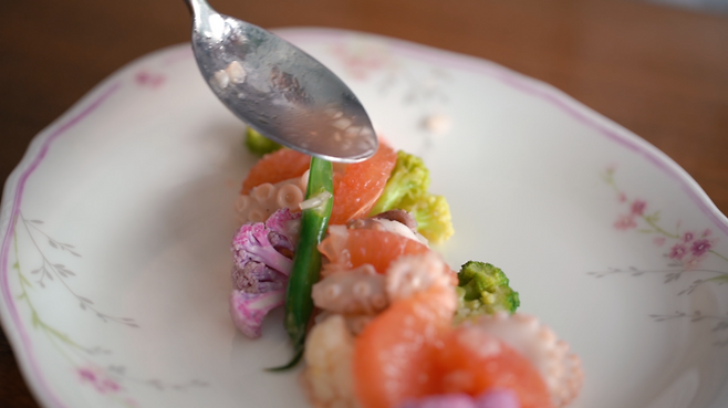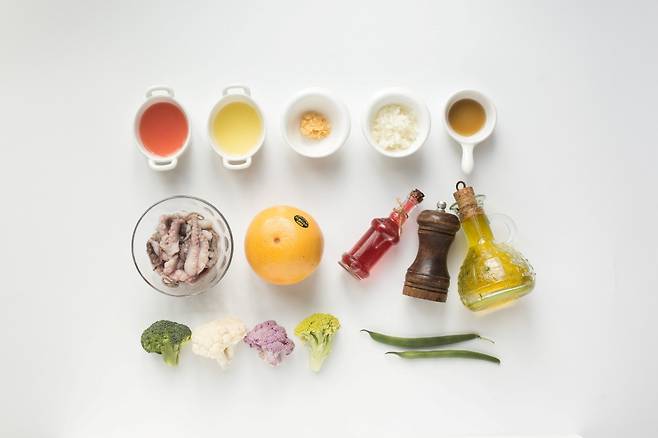 자몽 1개, 주꾸미 8마리, 콜리플라워 15g, 그린 브로콜리 15g, 퍼플 브로콜리 15g, 그린빈스 2개, 식초 2큰술, 레몬즙 2큰술, 자몽즙 4큰술(허브) 다진 양파 1/2큰술, 다진 마늘 1작은술, 올리브오일 2큰술, 피쉬소스 1작은술, 후추 약간