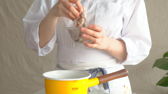3. 주꾸미는 끓는 물에 10초만 살짝 데친다. 발이 바깥으로 뒤집어지면 바로 꺼내어 얼음물에 식혔다가 건진다.