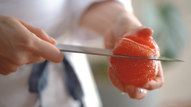 1. 자몽은 껍질을 제거 한 후 과육만 분리해 반으로 자른다.