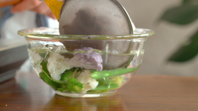 2. 브로콜리와 콜리플라워는 한입 크기로 썬다. 그린빈스는 반으로 자른 후 끓는 물에 데쳤다가 찬물에 바로 식혀 건진다.