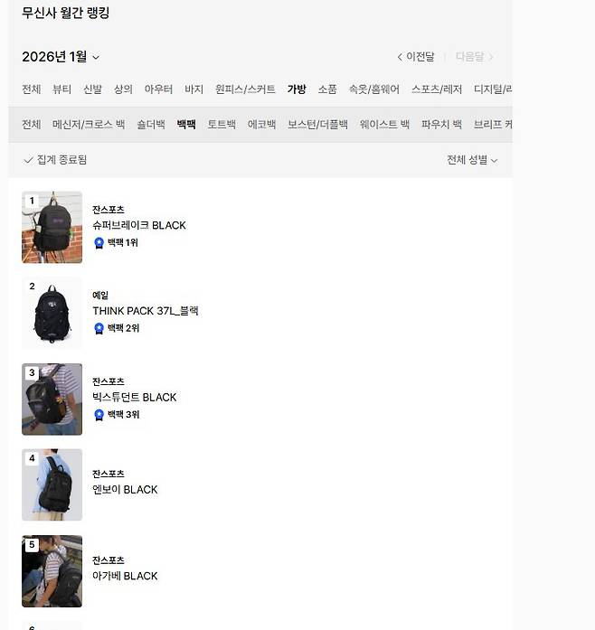 무신사에서 1월에 가장 많이 판매된 백팩 순위에