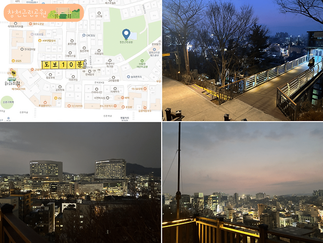 ‘신촌기차역’에서 10분만 도보로 이동하면 도착하는 ‘창천근린공원’은 주변 자취생들만 아는 벚꽃 명소다. 봄에는 벚꽃이 유명하지만 벚꽃이 피지 않는 나머지 계절에는 신촌 일대에서 가장 아름다운 야경을 구경할 수 있는 곳이기도 하다.
