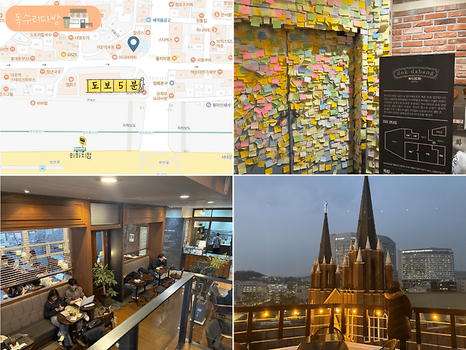 복층 구조의 매장 안에서는 데이트 중인 커플부터 다이어리를 꾸미는 청년들까지 다양한 모습이 펼쳐진다. 1회 무료 커피 리필과 수제로 만든 음료는 독수리다방만의 매력으로 꼽힌다. 창가 자리에서는 창천교회를 배경으로 인증샷을 남기려는 외국인 유학생들의 모습도 쉽게 찾아볼 수 있다.