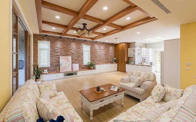 수납과 조명의 조화도 인상 깊다. 넓은 오픈 책장은 부부가 수집한 책과 여행 기념품을 세련되게 정리할 수 있도록 했다. 거실 천장의 우드 그래픽과 주방의 클래식 조명은 공용 공간의 맥락을 연결하며 공간 전체에 통일감과 품격을 부여한다.