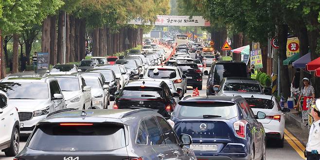 | ▲ 추석 연휴를 일주일 앞둔 8일 오전 인천 부평구 인천가족공원 입구가 성묘객들 차량으로 붐비고 있다. |