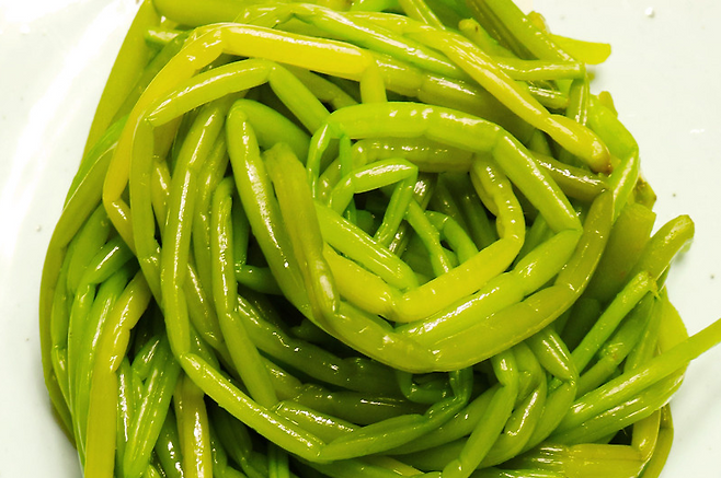 소금을 약간 넣은 끓는 물에 2~3분 데친 뒤 찬물에 헹구고 껍질을 제거하면 아삭하면서도 부드러운 식감을 살릴 수 있습니다.