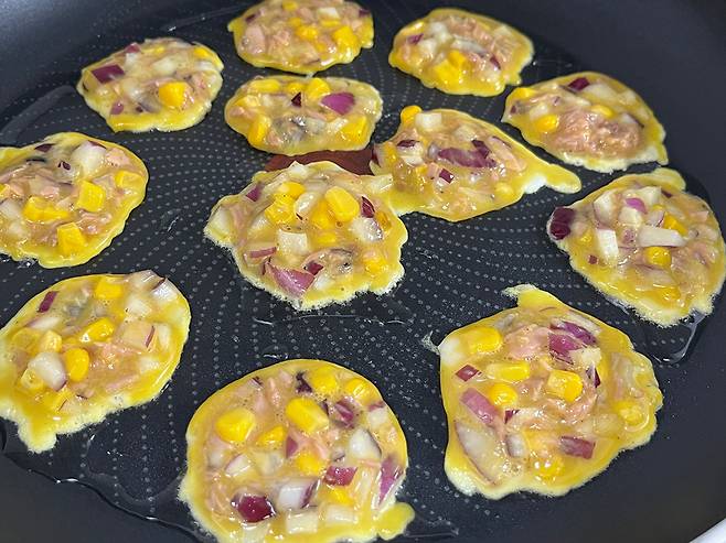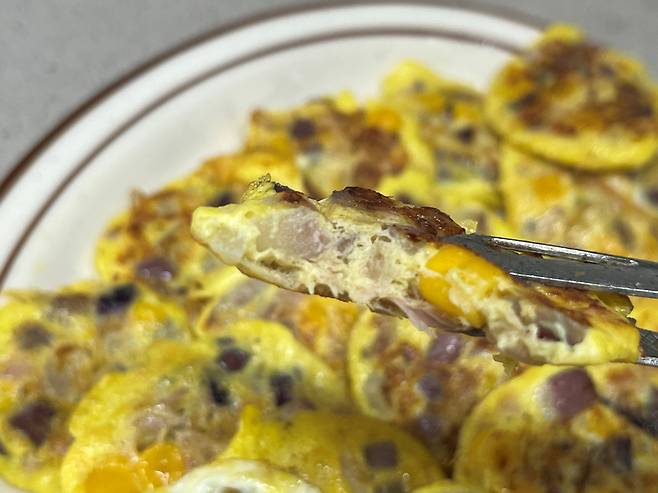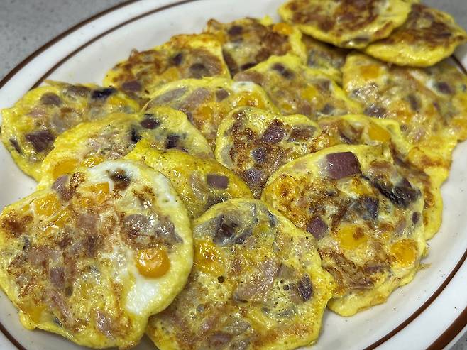 이렇게 만들면 모양도 예쁘고, 영양가도 좋은 계란전이 완성됩니다. 톡톡 씹히는 옥수수와 양파 덕분에 식감도 좋습니다. 맛은 말할 것도 없고요.