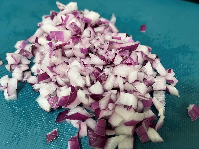 양파 1/4개는 잘게 썰어서 준비해 주세요. 입자가 크면 반죽에서 잘 떨어지기 때문에 최대한 작게 잘라 줍니다.