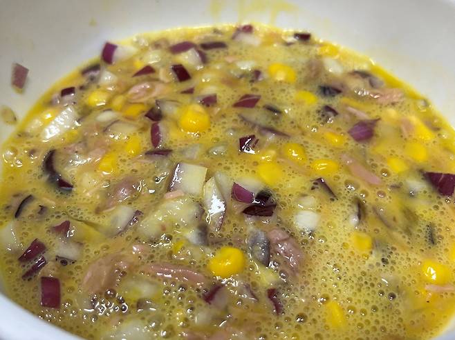 계란과 나머지 재료를 잘 풀어서 섞으세요. 그럼 이렇게 계란전 반죽이 완성됩니다. 양파, 참치, 옥수수만 넣어도 충분히 맛있는 조합입니다.
