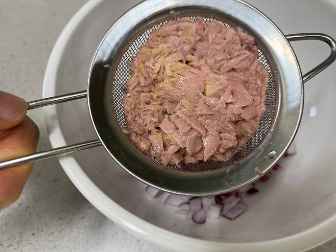 참치를 활용한 텐데요. 참치는 기름기를 제거하는 것이 중요합니다. 참치 기름은 꽉 짜서 제거해야 요리가 느끼하지 않고 담백해집니다.