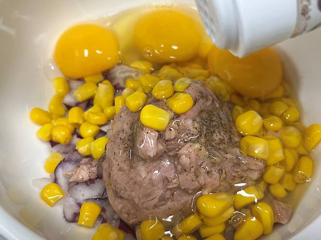 그릇에 다진 양파와 기름 뺀 참치, 그리고 옥수수 2스푼 넣고 계란을 3알 깨서 넣으세요. 그리고 소금, 후추를 살짝 넣어서 밑간을 합니다.