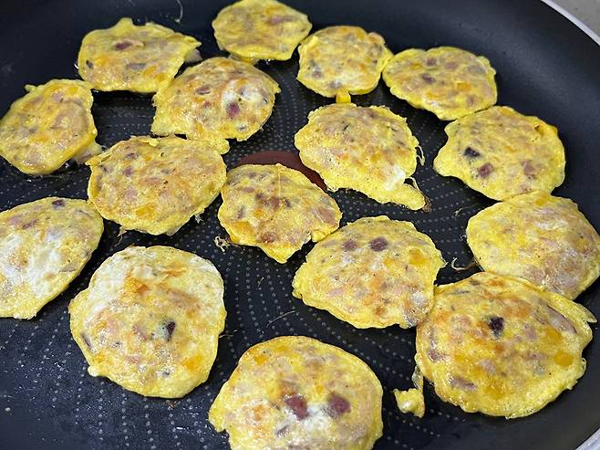 계란전은 모든 재료가 금방 익기 때문에 조리시간이 짧은 것 또한 장점입니다. 계란물이 굳으면서 익으면 뒤집어서 반대쪽도 익혀 주세요. 살짝 노릇한 상태로 굽는 게 좋습니다.