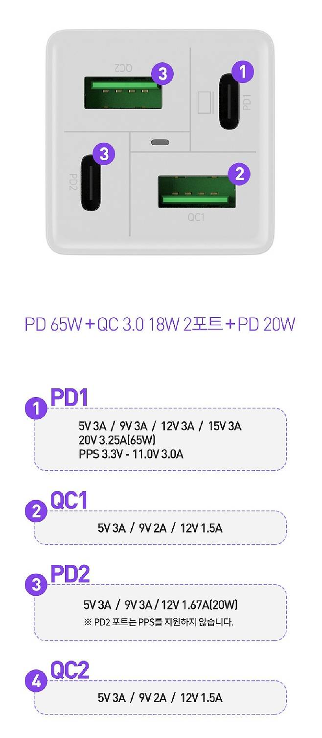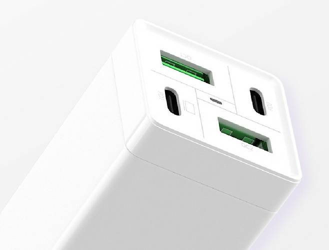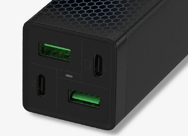 PD 고속충전을 위한 C형 포트는 2개가 있는데요. 1개는 PPS 지원으로 충전 속도가 65W이고 다른 1개는 20W입니다. 최대 출력량 65W 짜리 포트로 노트북을 바로 충전할 수 있죠. (물론 노트북에도 PD 충전 기능이 있어야 합니다.)