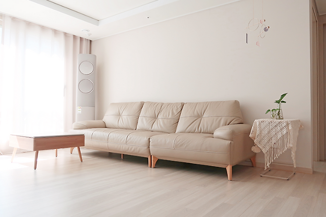 거실 뒤쪽은 베이지톤의 소파로 따뜻한 분위기를 조성했고, 식물과 모빌로 포인트를 줬어요.