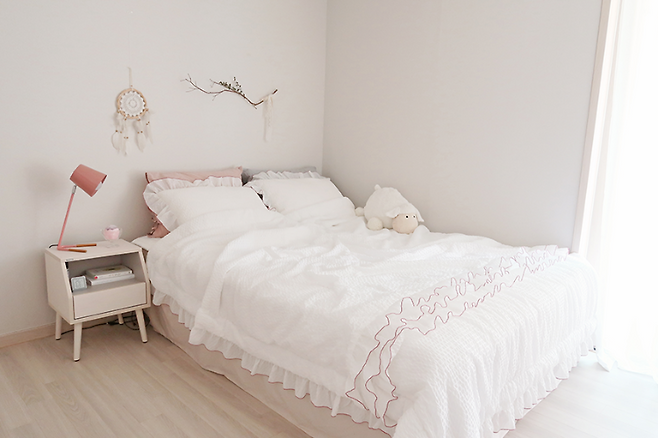 또한 다양한 침구세트로 매번 다른 느낌의 침실 인테리어를 완성하고 있어요. 핑크, 베이지, 화이트까지 패브릭 스타일링으로 변화무쌍한 공간이 되는 침실입니다.