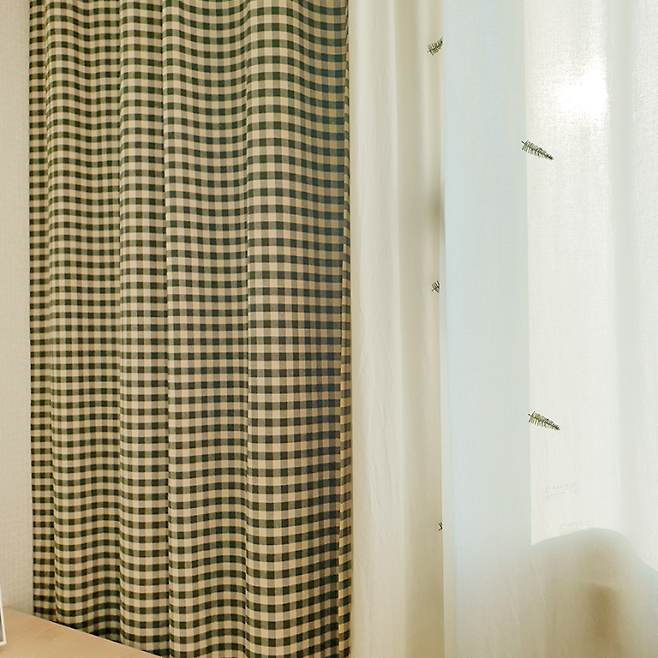보통 커튼은 무난한 아이보리, 화이트를 선택하게 되는데 과감한 컬러에 도전해보세요! 저녁노을빛이 예쁘게 들어오는 드레스룸은 녹색 포인트의 커튼을 달아줬더니 훨씬 따뜻한 공간이 되었어요.