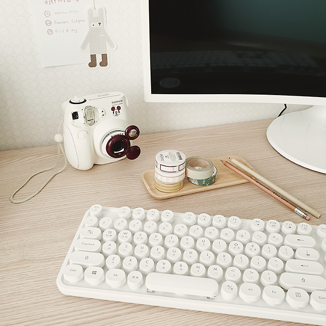 책상 위는 다양한 오브제들을 사용해 꾸며줬는데 폴라로이드 카메라나 마스킹 테이프, 심지어 연필마저도 하나의 좋은 소품이 될 수 있습니다.
