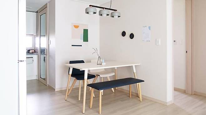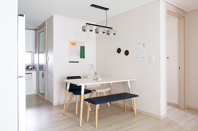 다음은 다이닝 공간입니다. 베이지 톤으로 모든 공간을 꾸미면 자칫 지루할 수 있어서 과감하게 네이비로 포인트를 준 공간이에요.