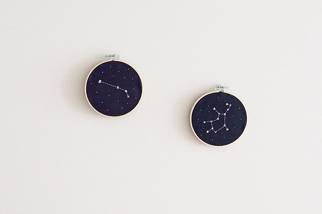 다이닝 공간의 벽을 꾸민 이 소품은 저희 부부의 별자리를 자수로 새긴 액자입니다. 자수틀 그대로 벽에 걸어 색다른 소품이 되었어요.