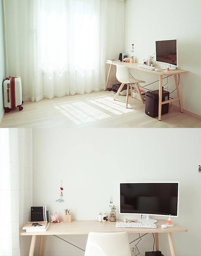 다음으로 서재입니다. 2인용 큰 테이블을 구입한 이유는 공부 공간과 컴퓨터 공간을 나누고 싶었기 때문이에요.