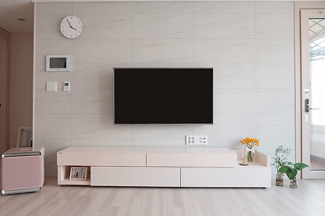 거실장은 다양한 소품을 전시할 수 있는 디자인으로 선택했습니다. 좌측 하단과 우측 상단 자리를 자주 바꿔주면서 인테리어가 질리지 않도록 하고 있어요.