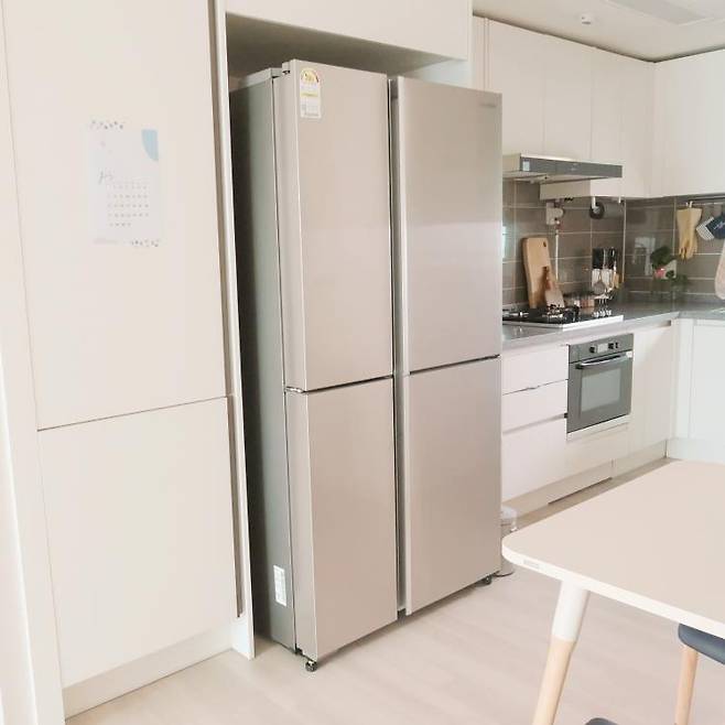 식탁 바로 옆엔 냉장고가 위치해있어요. 양문형 냉장고라 사용하기 편하더라고요.