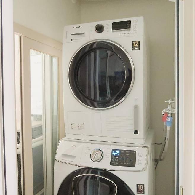 베란다 한쪽 편엔 건조기와 세탁기가 위치해있어요. 좁은 공간임에도 불구하고, 맞춤한 거처럼 알맞게 들어가서 만족스러워요.