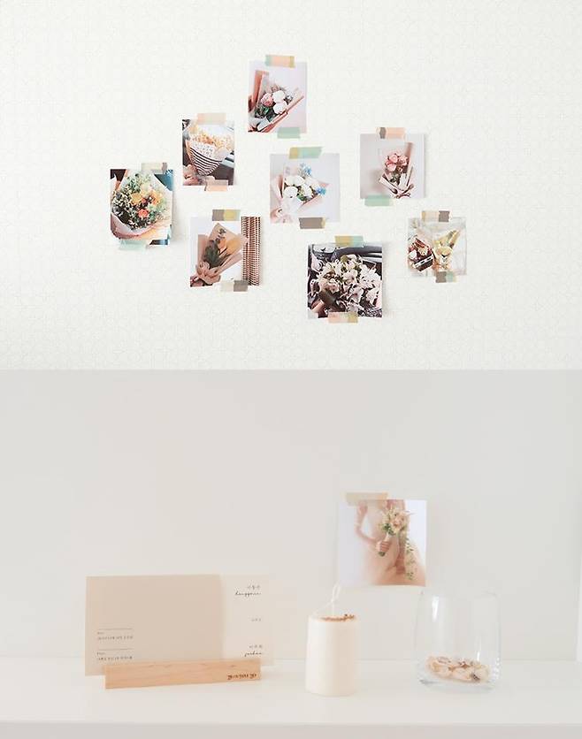 신랑에게 받았던 꽃을 찍은 사진은 벽을 꾸미는 아이템으로 활용했고, 청첩장, 말린부케를 활용해 만든 캔들로는 장식장을 꾸며줬어요.