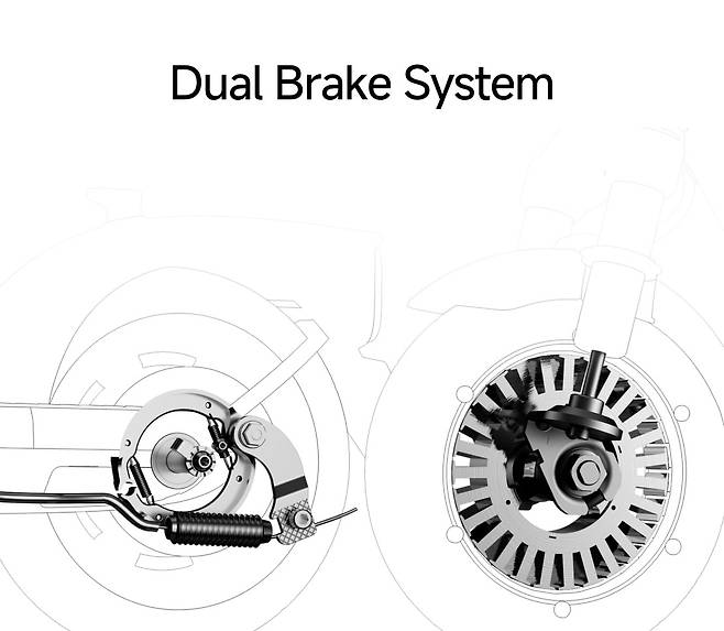 브레이크 시스템은 전자식 전륜 브레이크와 후륜 드럼 브레이크가 하나의 레버로 동시에 작동되는 방식으로 구성됐다. 이는 오카이(Okai)의 ES20 모델에서도 쓰인 적이 있는 구조이며, 일반적인 주행에서는 충분히 효과적이다. 다만 젖은 노면에서는 제동거리가 길어질 수 있어 주의가 필요하다.