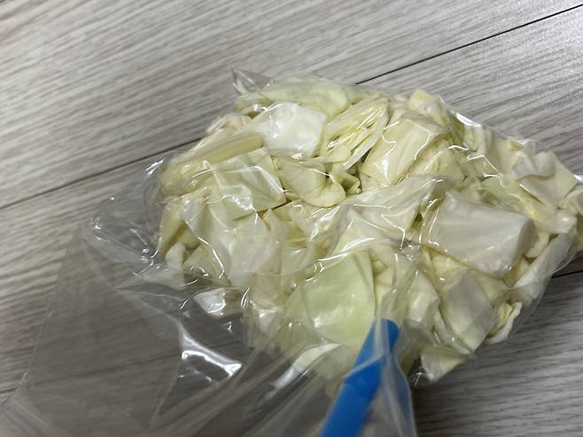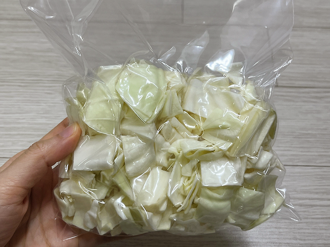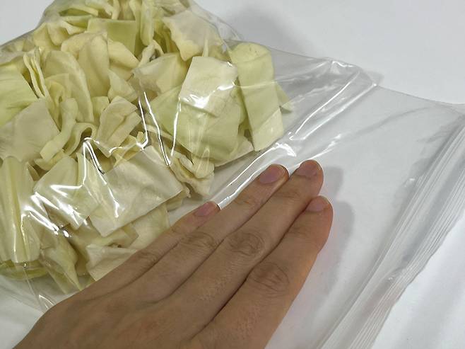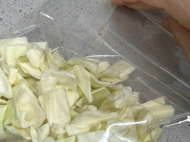 양배추가 든 지퍼백의 공기를 최대한 빼세요. 아무래도 양배추는 공기와 접촉하면 갈변이 빠르게 진행되고 상태도 안 좋아집니다.