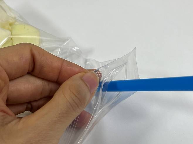 지퍼락은 빨대가 들어갈 만큼의 공간만 남기고 꽉 잠가 주세요. 그리고 빈 틈으로 빨대를 넣어 줍니다.