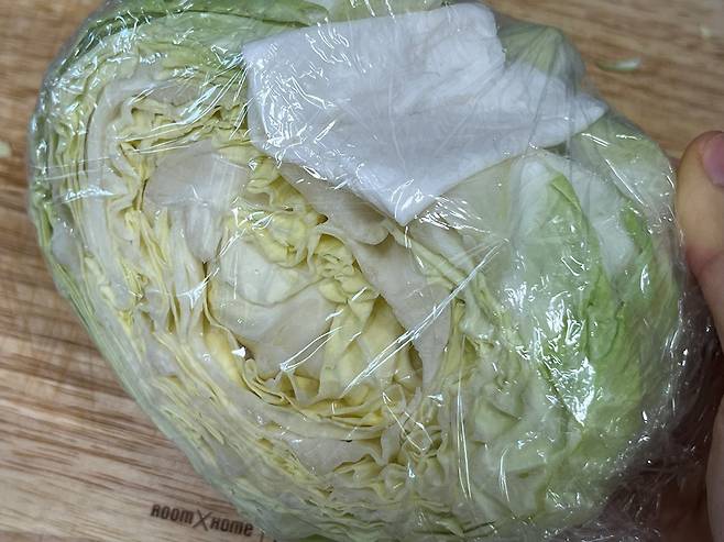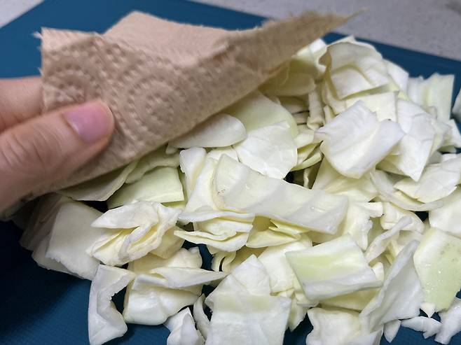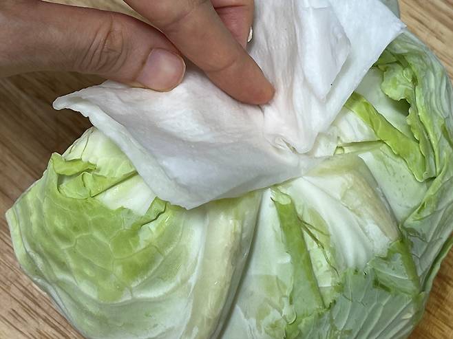 물에 적신 키친타월을 심지 도려낸 부분에 덧대어 줍니다. 수분을 머금은 키친타월이 양배추 속의 수분 균형을 유지해 주고, 쉽게 마르거나 갈변되는 것을 막아줍니다.