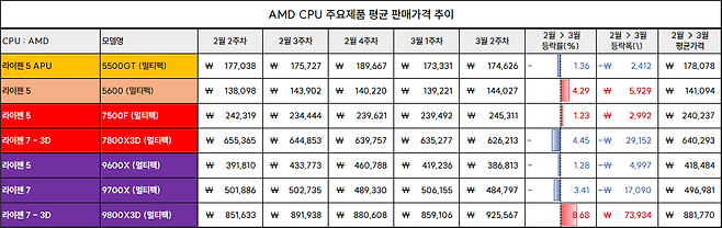 2개월 연속 가격을 내렸던 9800X3D(+8.68%)는 3월 1주~2주 사이에 갑자기 평균 판매 가격이 솟구치기도 했다. 일시적으로 재고가 부족했던 것으로 파악됐으며 현재는 해결 돼 정상적인 가격으로 돌아갔다.